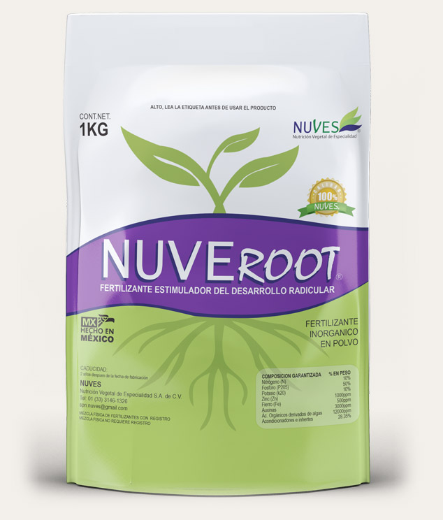 NuveRoot® es una formula nutricional diseñada para inducir y promover la formación de raíces de los cultivos, combinando macronutrientes, micronutrientes y un complejo auxínico induciendo así la formación de raíces, y un fortaleciente crecimiento posterior.